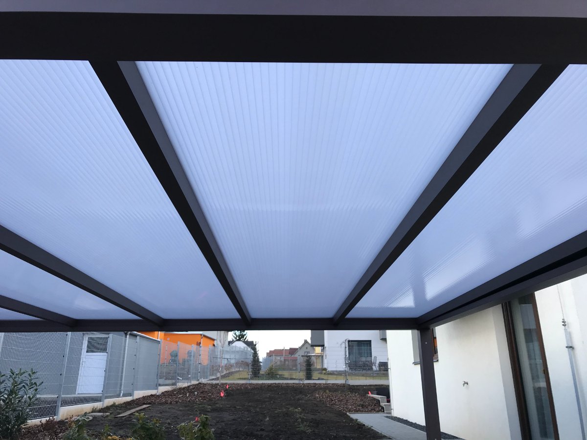 Střecha pergoly je tvořena systémem krokví a kvalitním dutinkovým polykarbonátem tloušťky 16 mm se sluneční ochranou Solar Control.