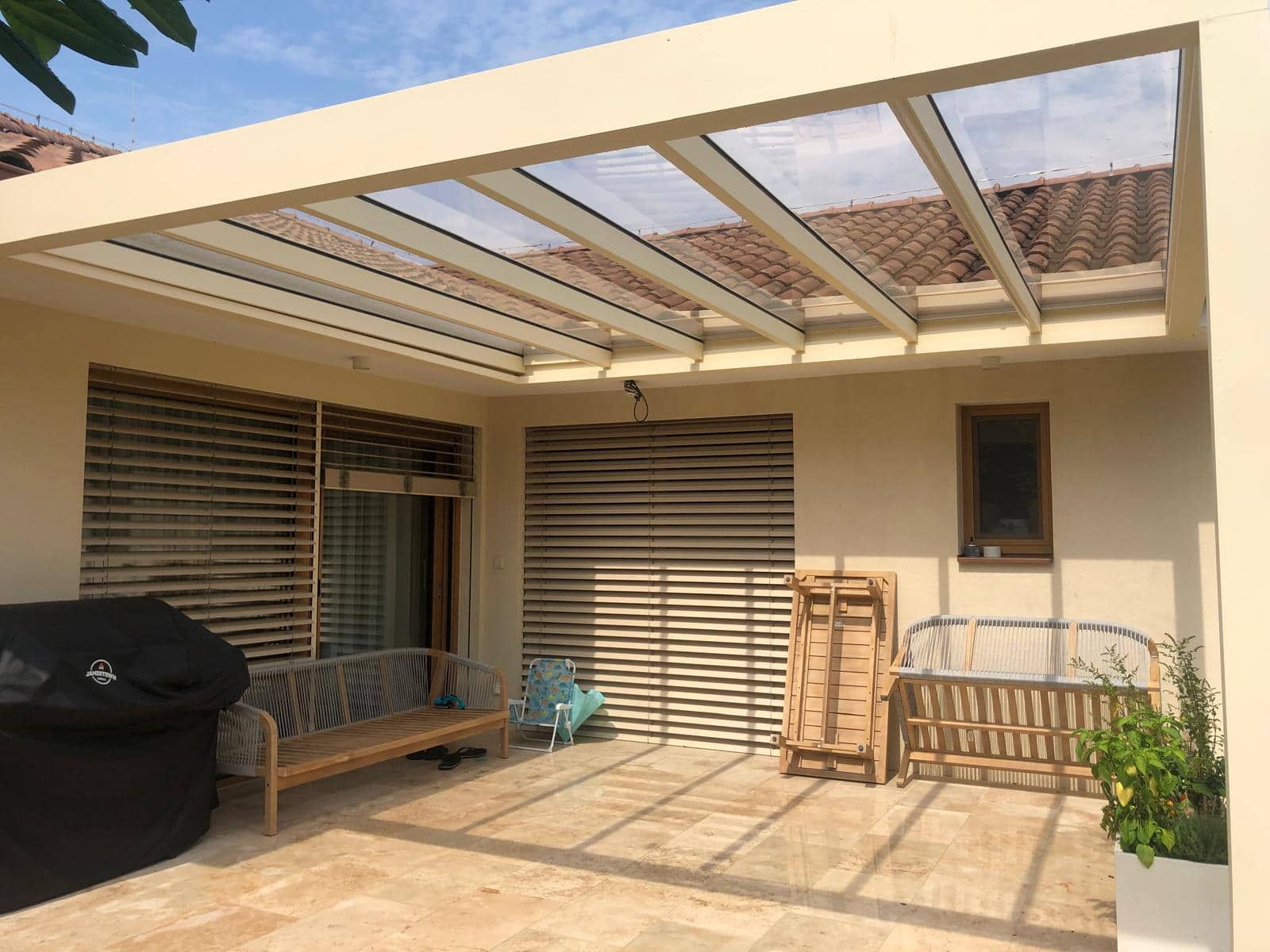 Možnost doplnění stěn pergoly o screenové rolety či posuvné bezrámové zasklení