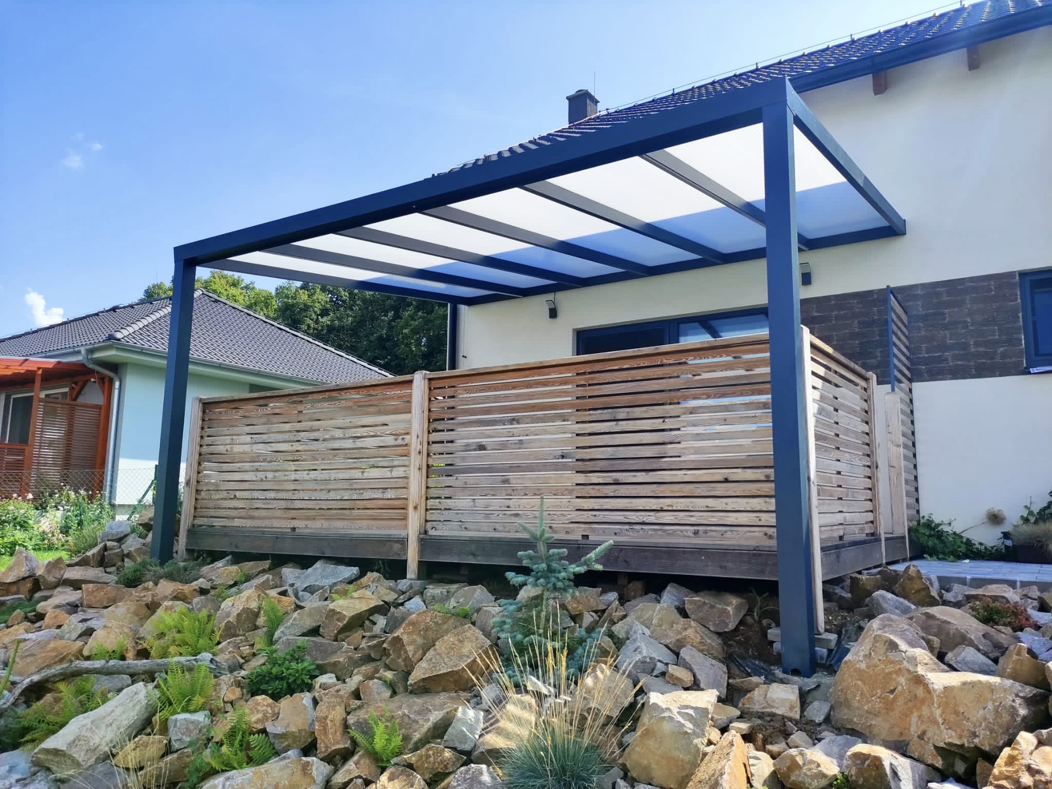 Kvalitní hliníková pergola s polykarbonátovým zastřešením až do maximálních rozměrů 7 m x 5 m.