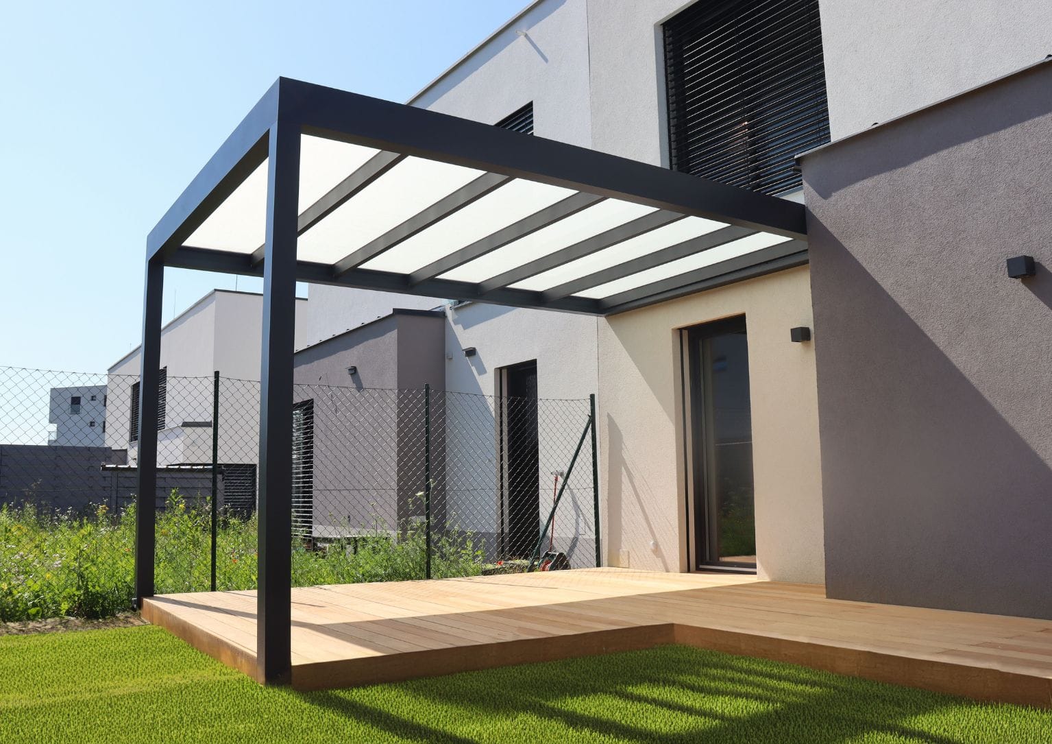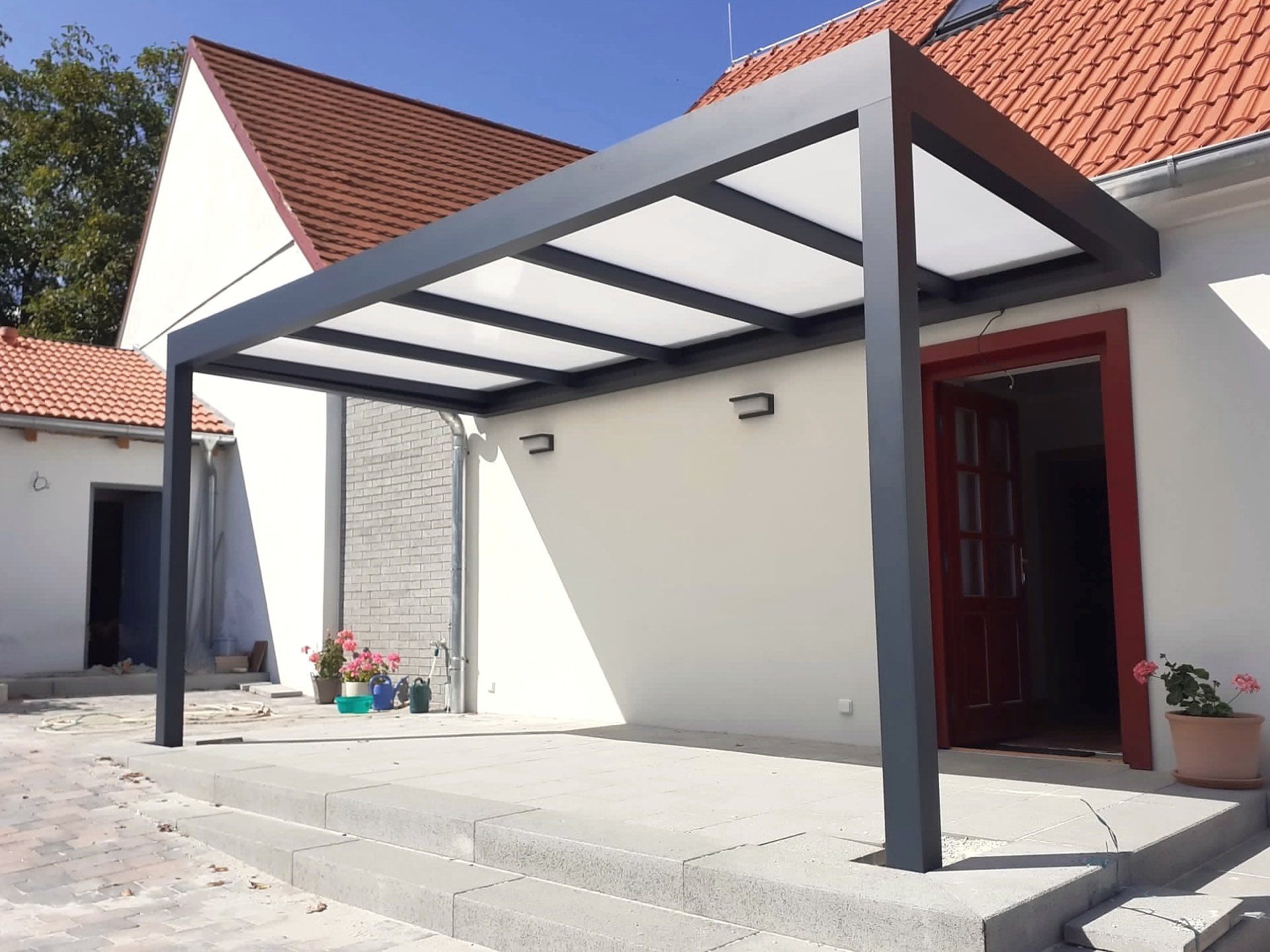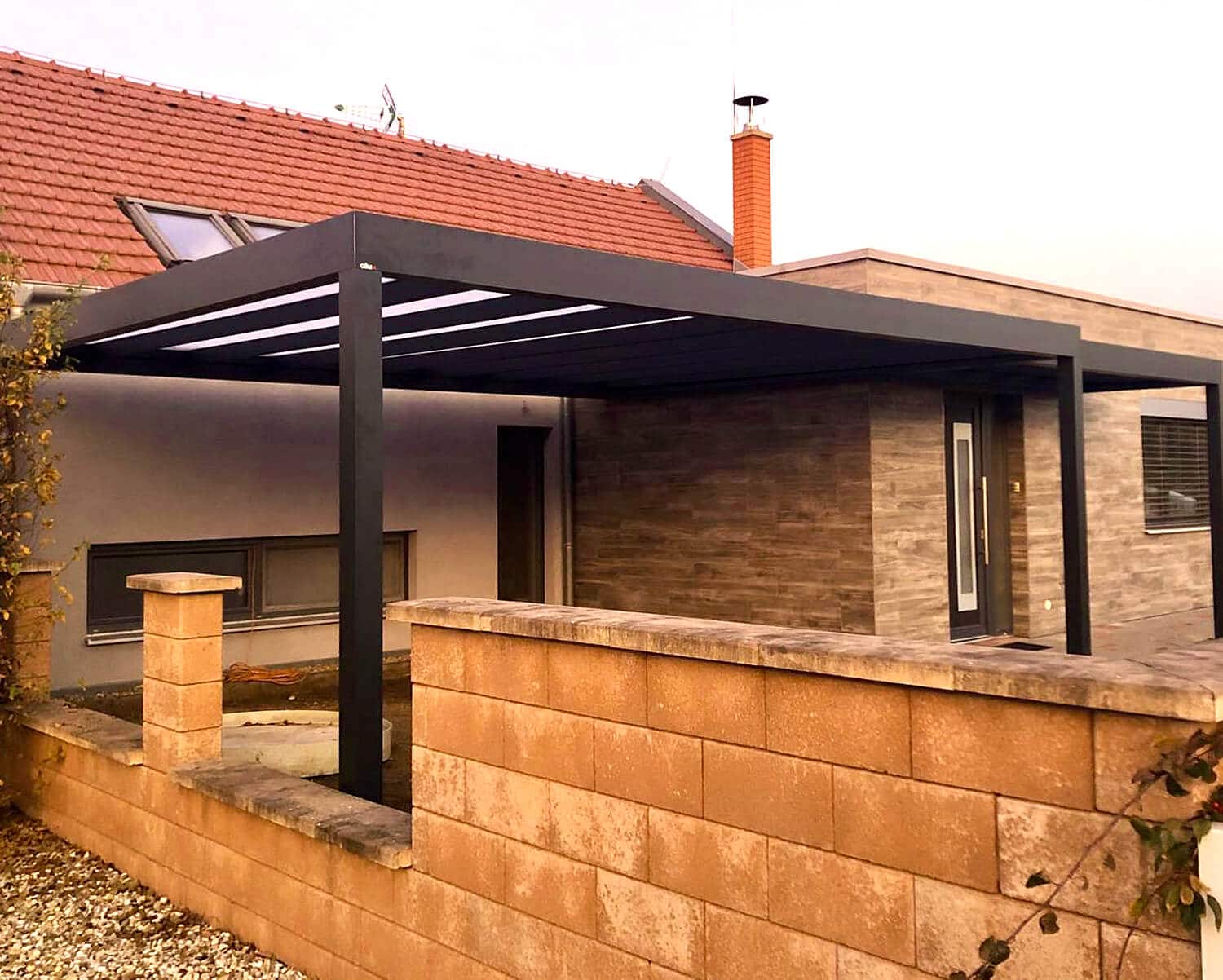 Pergola je tvořena hliníkovou konstrukcí s plochou střechou a integrovaným okapem uvnitř konstrukce.