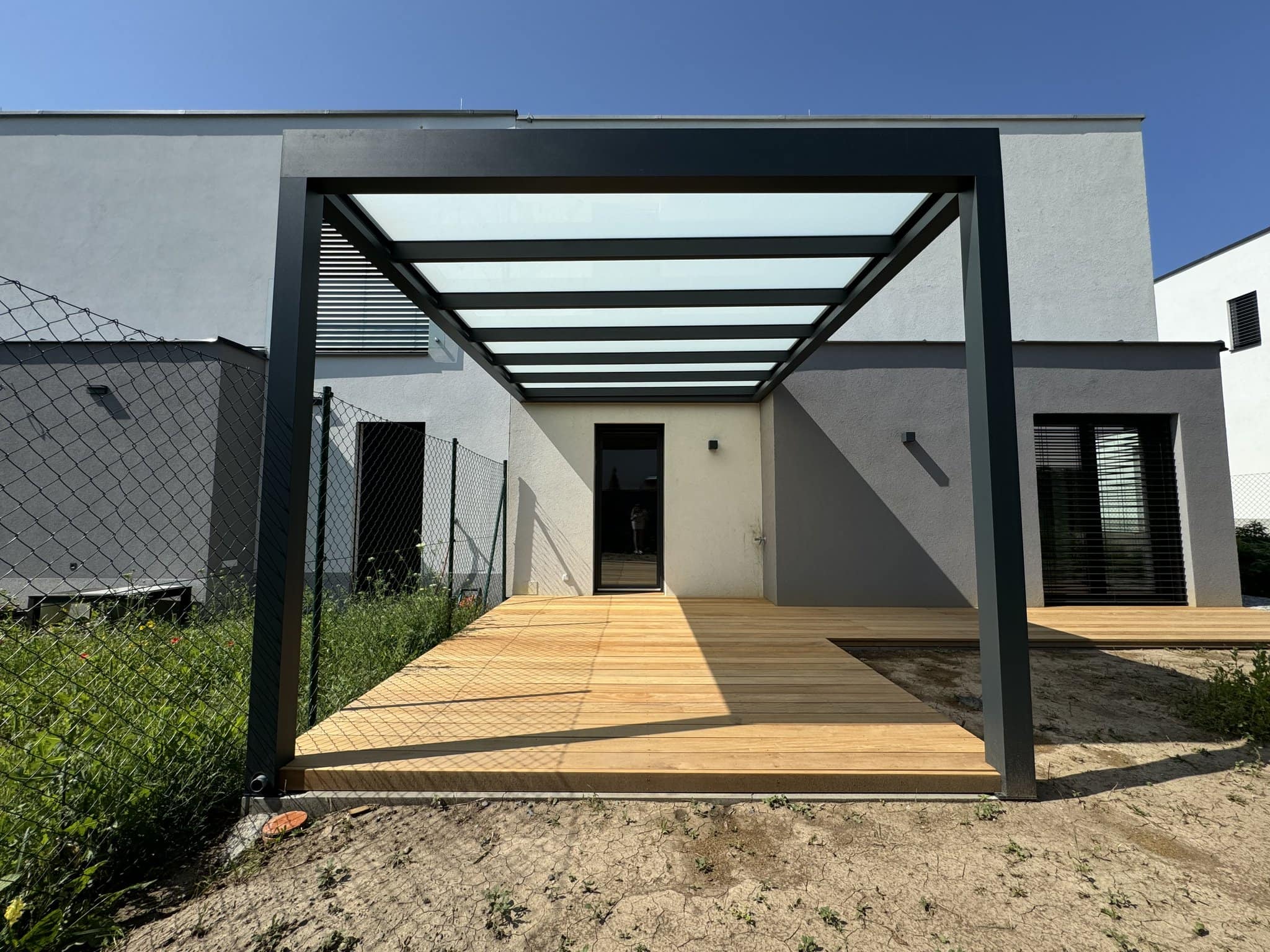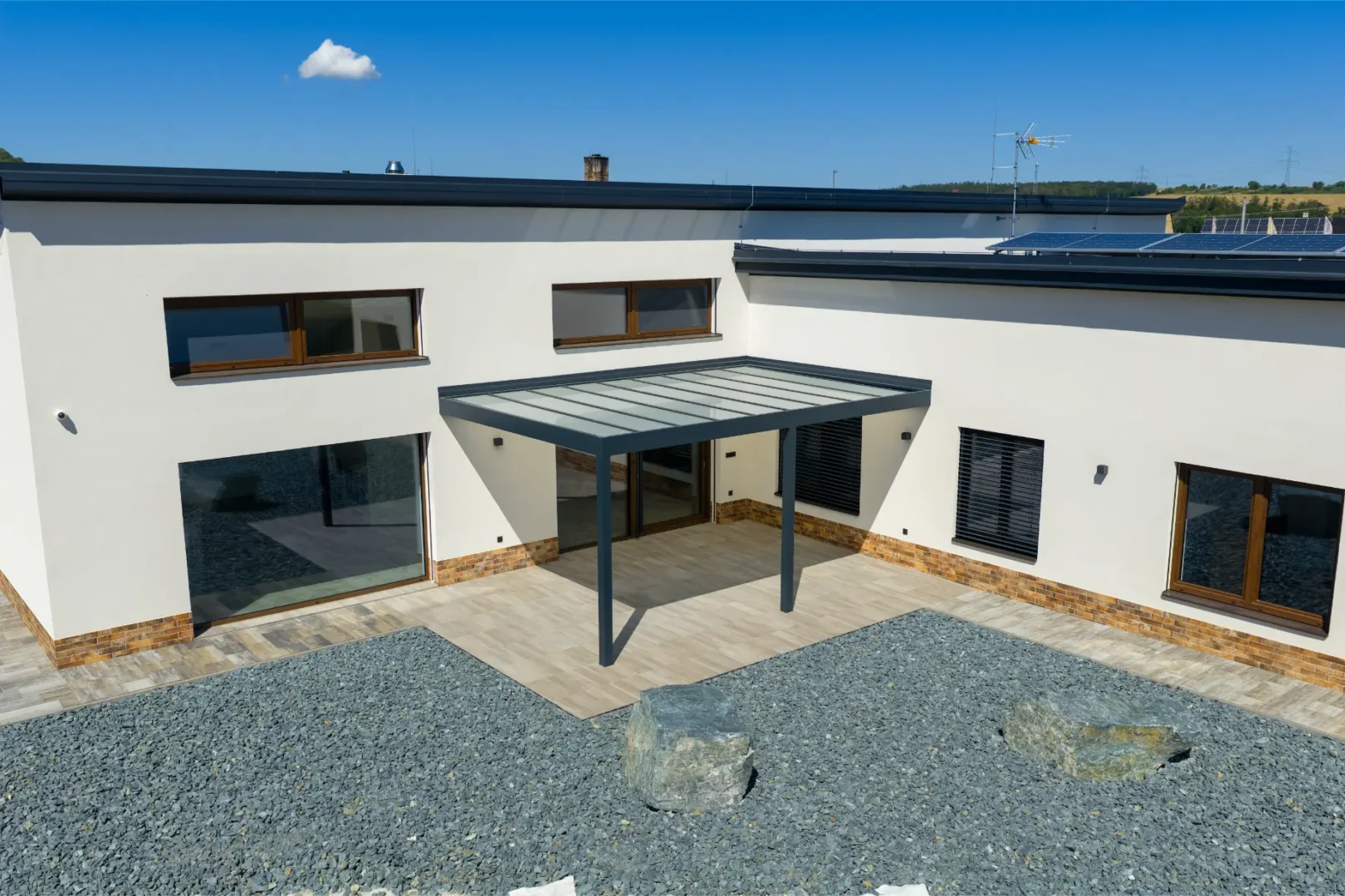 Pergola ALUX Glass je kvalitní hliníkový přístřešek s plochou střechou z bezpečnostních skel. Svým designem se hodí k moderním kubistickým liniím rodinných domů i vil.