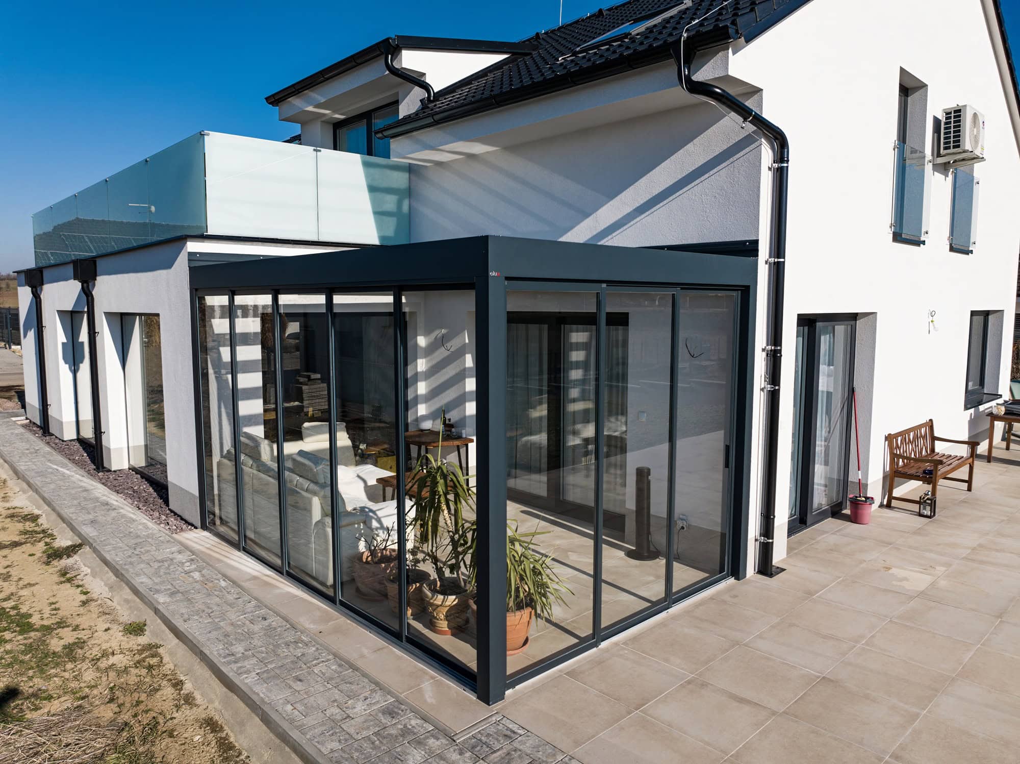 Možnost doplnění stěn pergoly o screenové rolety či posuvné bezrámové zasklení