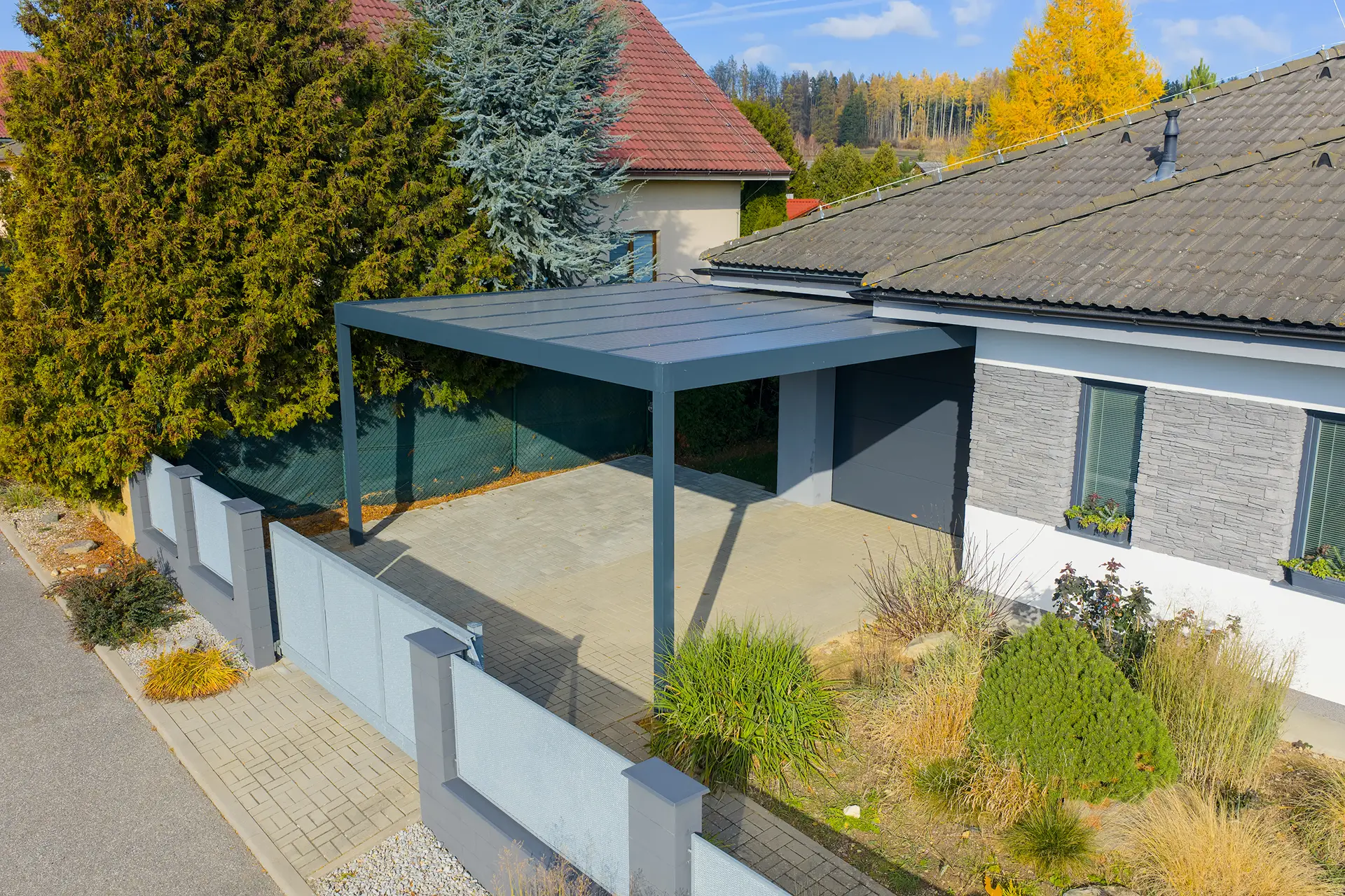 Rám přístřešku je k dispozici v několika barevných variantách, které jsou chráněny odolnou komaxitovou barvou. Tato povrchová úprava nejenže poskytuje dlouhodobou ochranu proti poškození, ale zároveň umožňuje sladit přístřešek s okolním prostředím či domem.