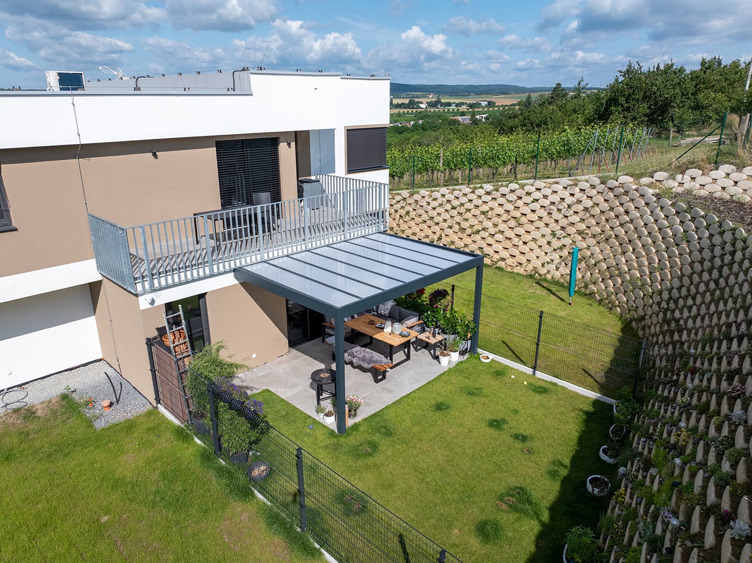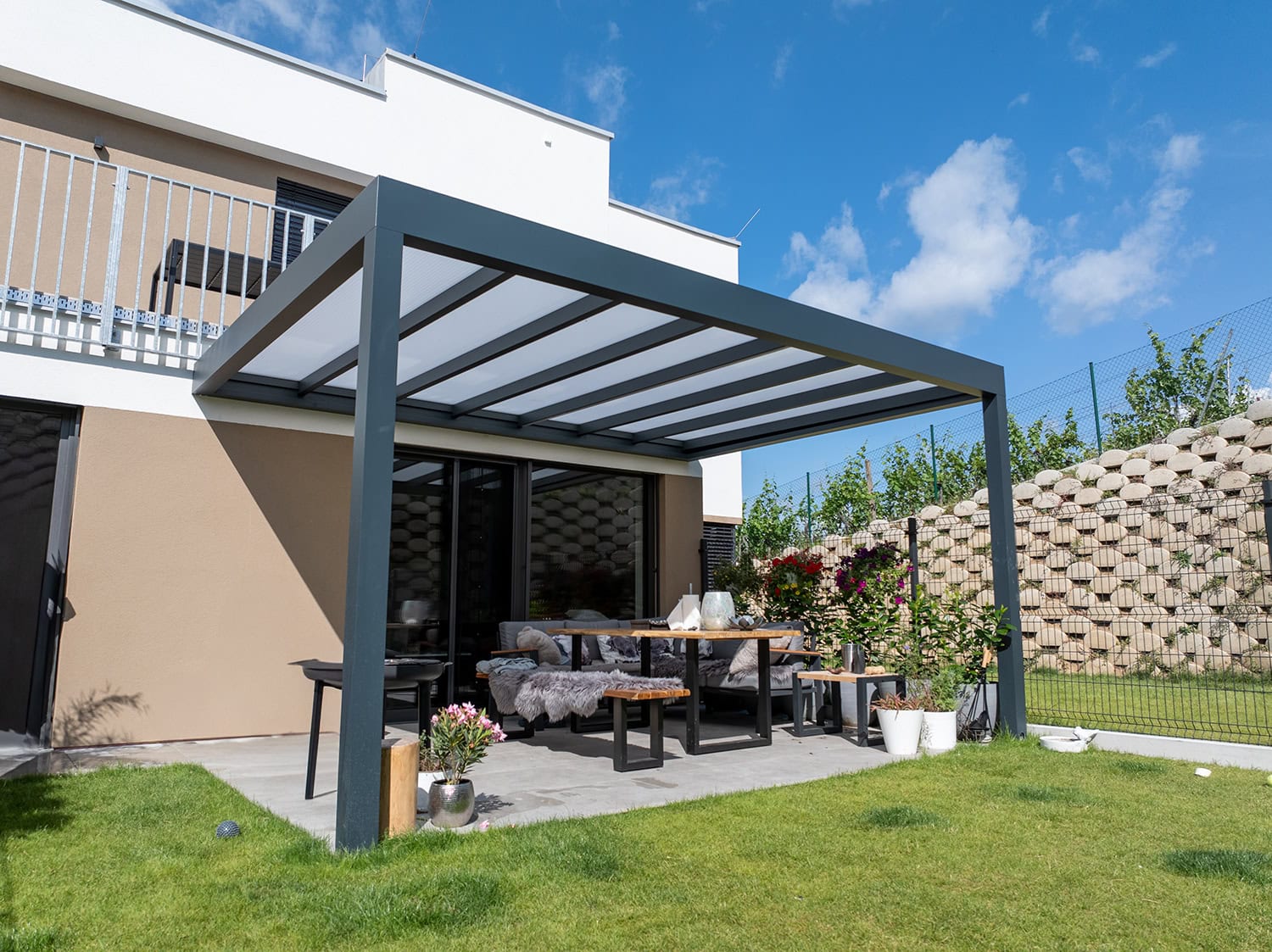 Možnost doplnění stěn pergoly o screenové rolety či posuvné bezrámové zasklení