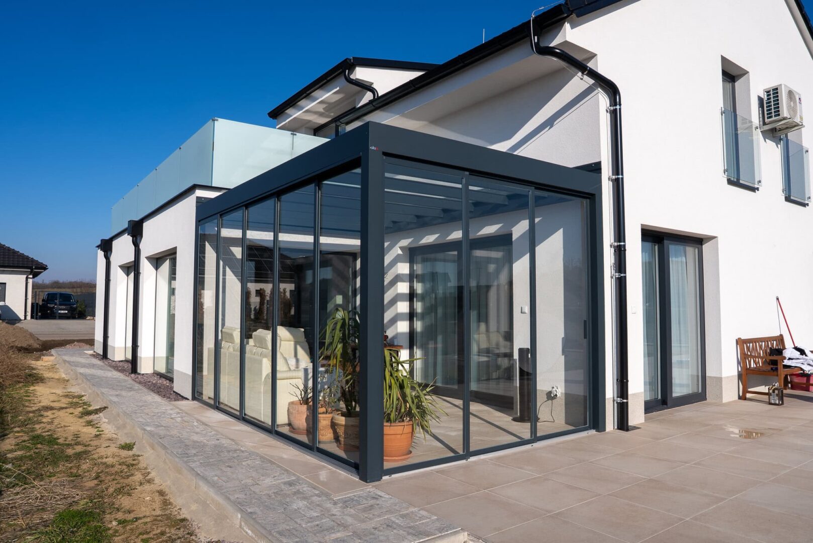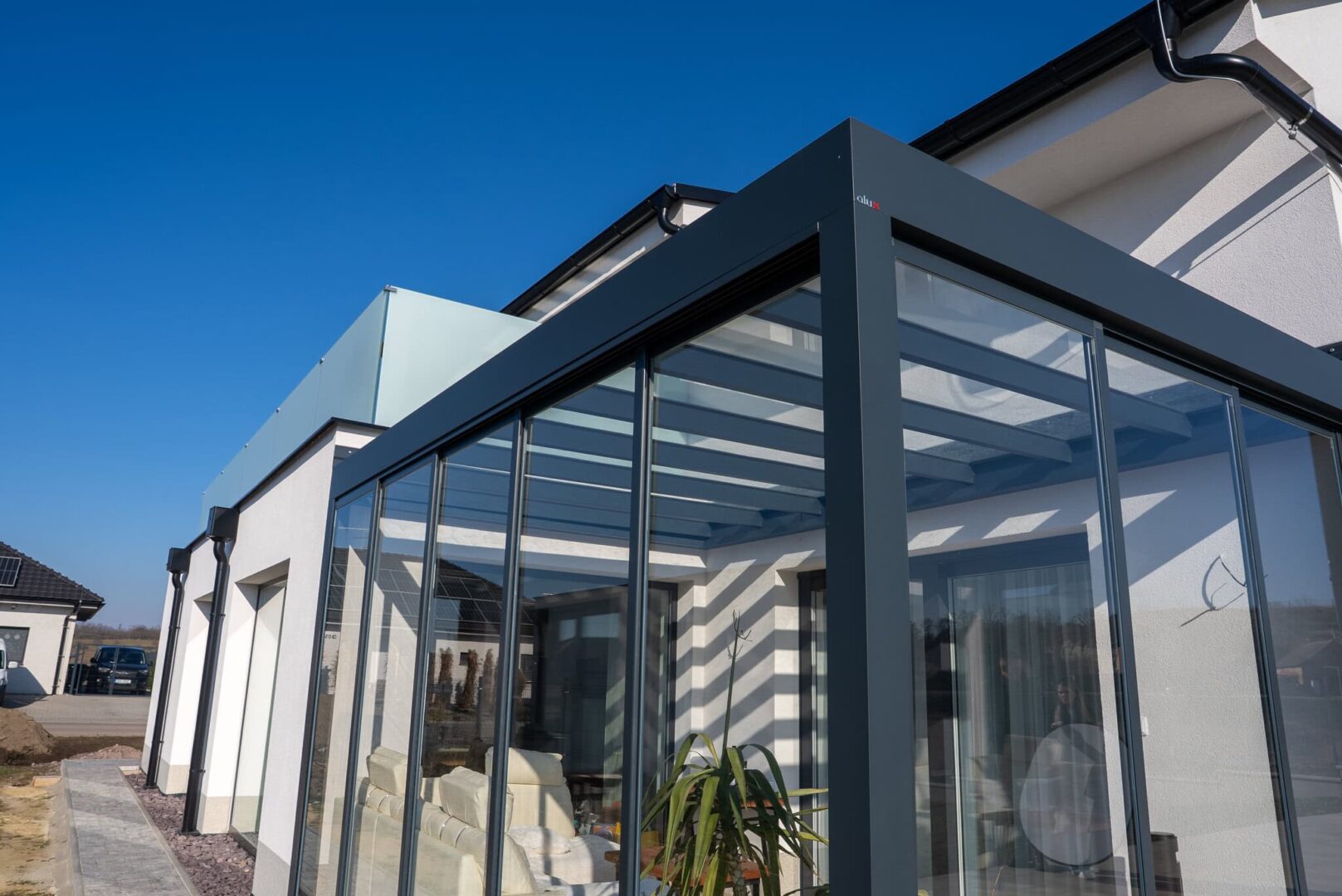 Možnost doplnění stěn pergoly o screenové rolety či posuvné bezrámové zasklení