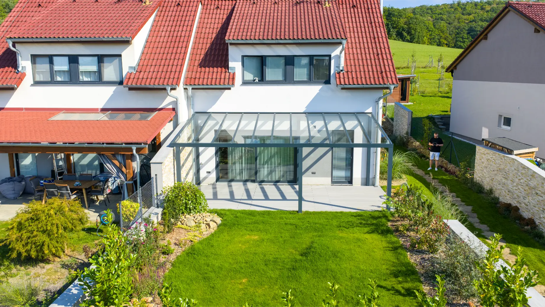 • Boční stěny mohou být zaskleny posuvnými stěnami a můžeme tak vytvořit sezónní zimní zahradu
