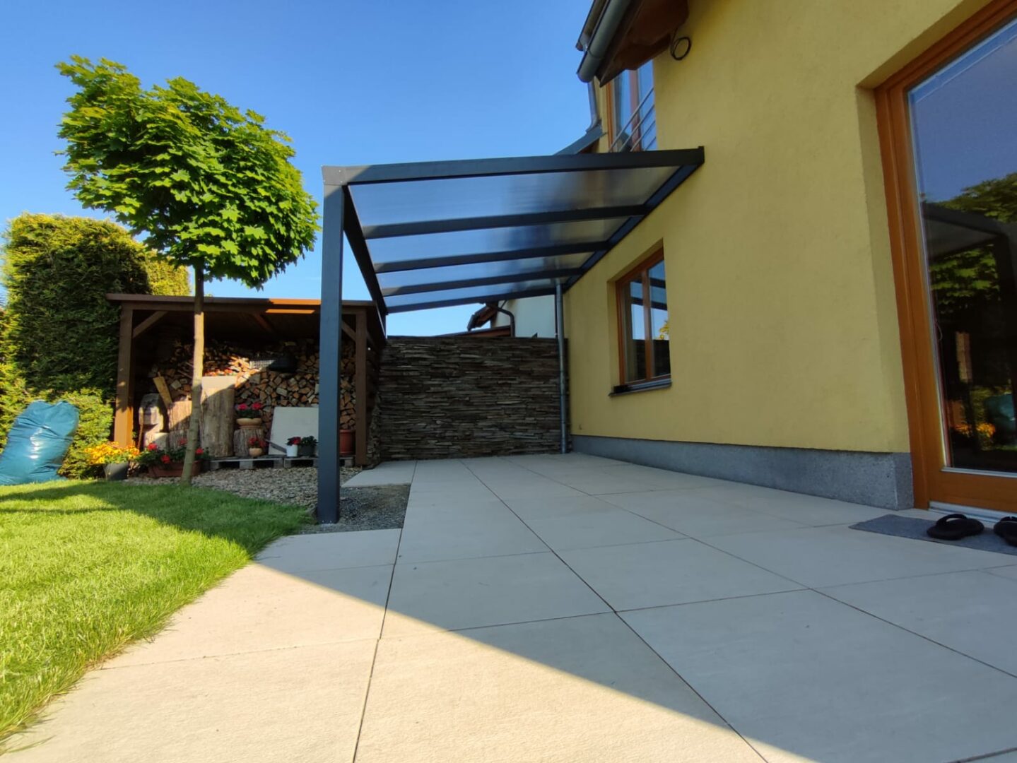 Boční stěny mohou být zaskleny posuvnými stěnami a můžeme tak vytvořit sezónní zimní zahradu