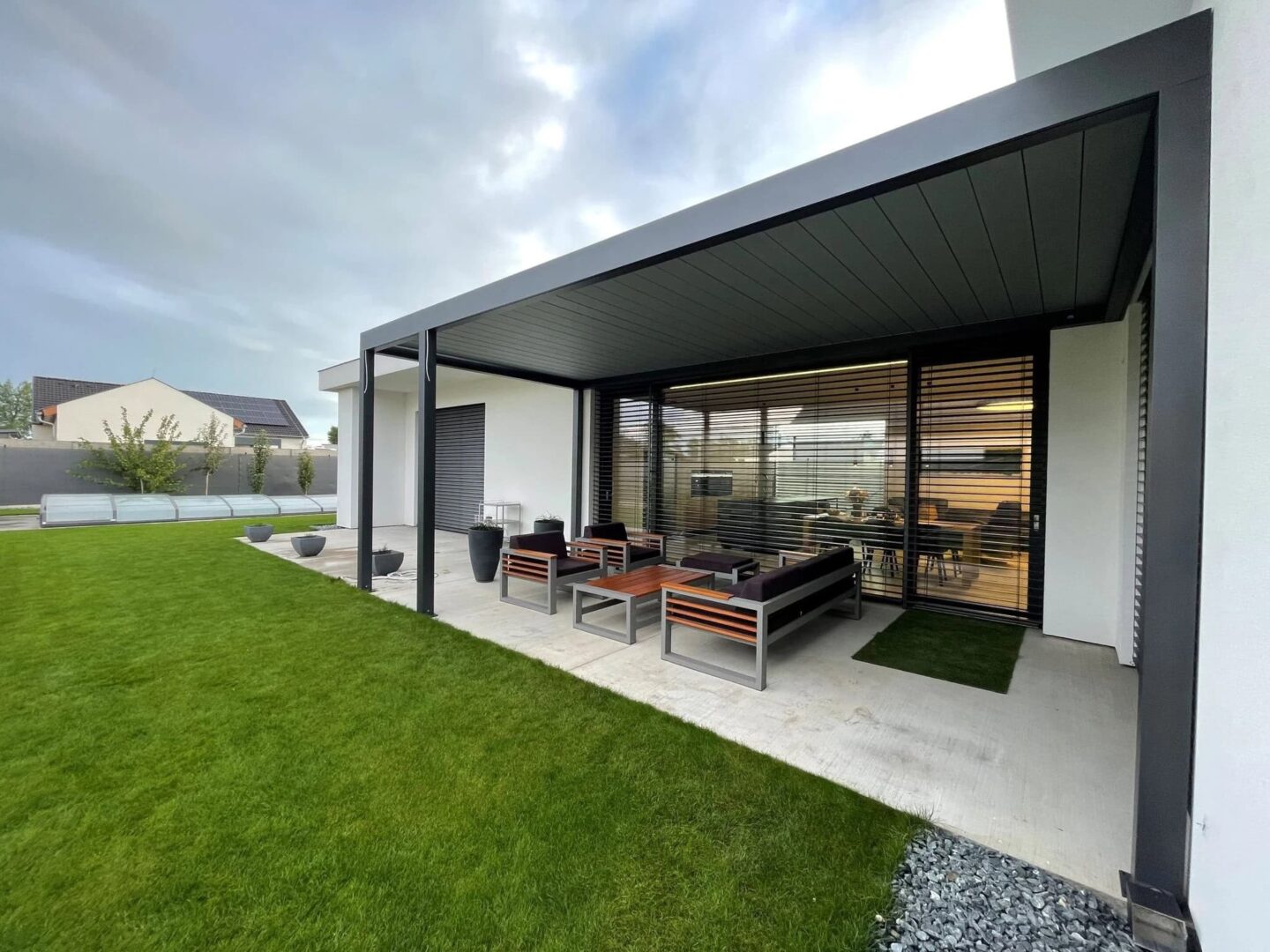 Hliníková pergola není jen přístřešek – stává se plnohodnotným rozšířením obytné části domu, které umožňuje komfortní využití terasy či zahrady po většinu roku.